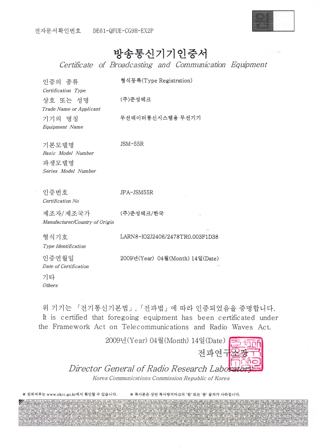 인증서(제품) | JSM-55R 방송통신기기인증서