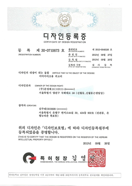 디자인등록증 | 이어마이크용 귀고리