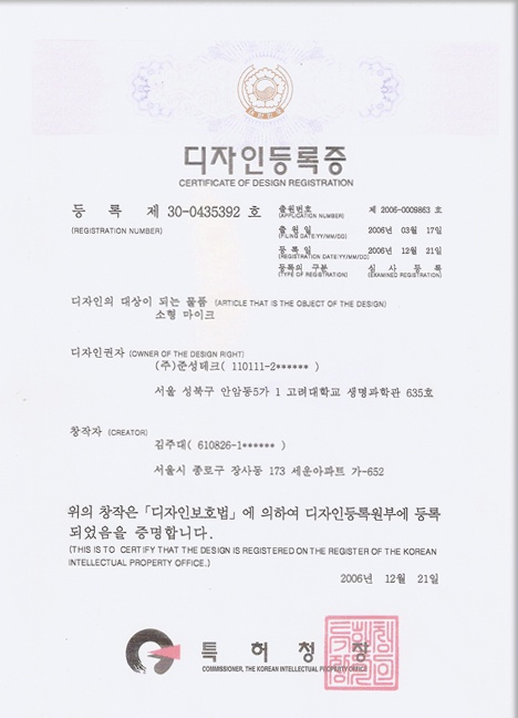 디자인등록증 | 소형마이크