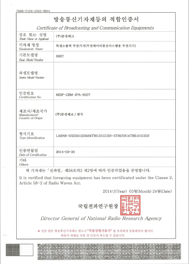 인증서(제품) | 600T 방송통신기기인증서