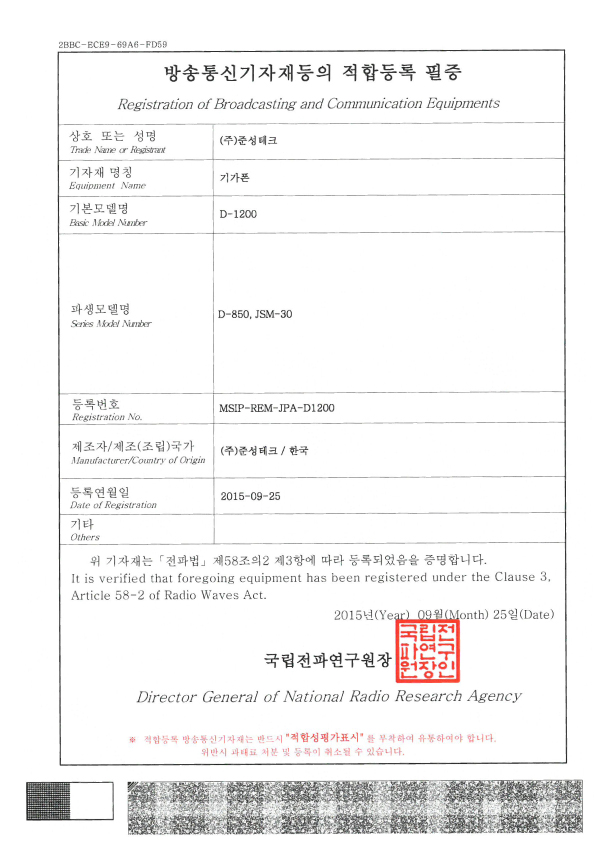 방송통신기자재 적합등록필증