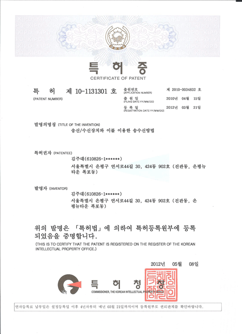 특허증 | 송수신장치